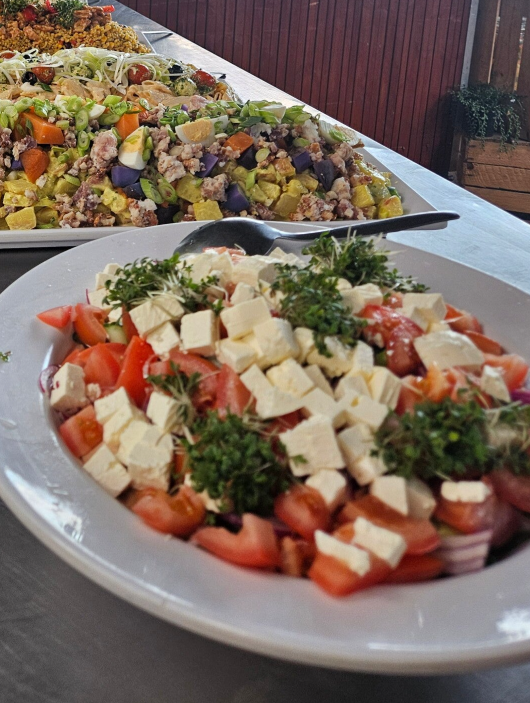 - Salade van zoetzure komkommer, feta, rode ui en tomaat en kruidendressing